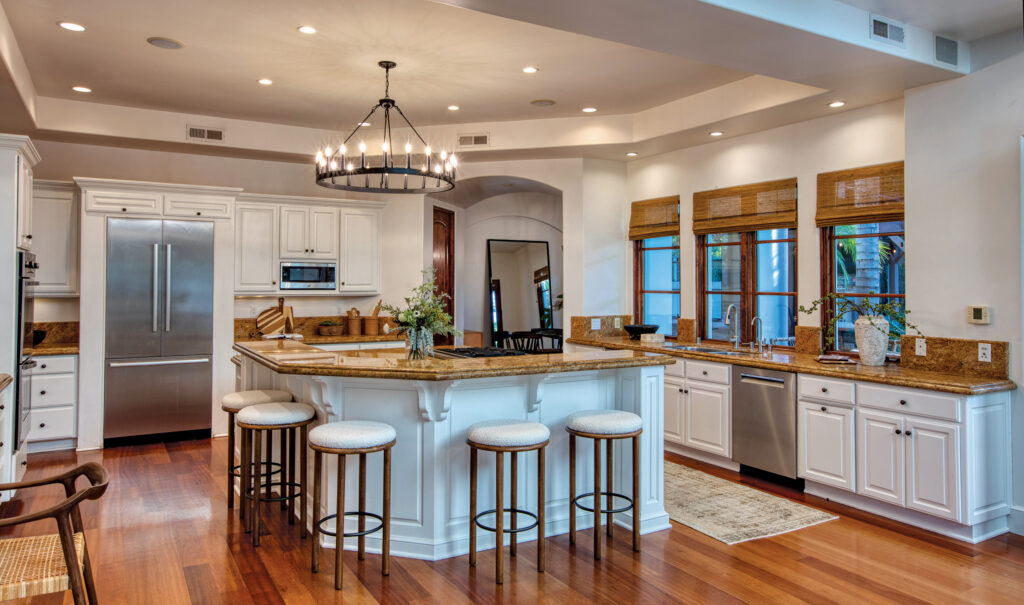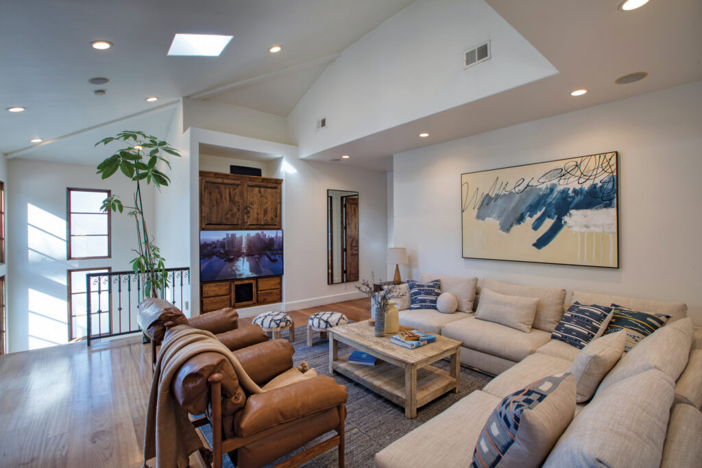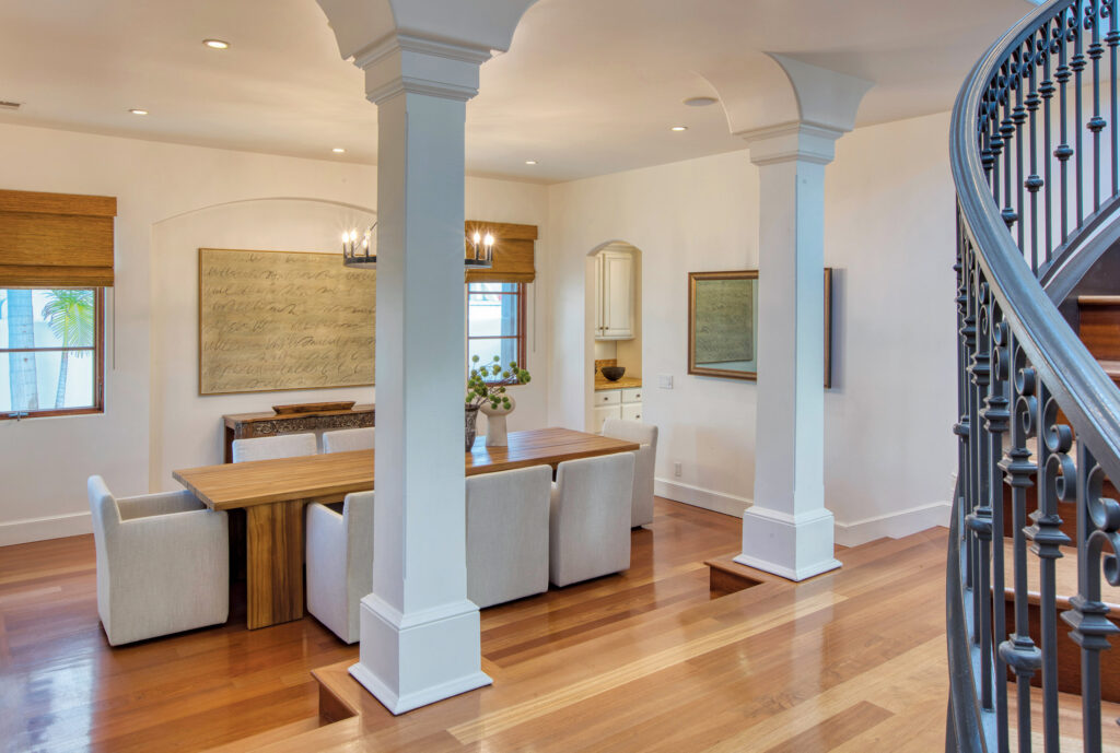 At the curb, you see a large, palm tree-flanked residence in a creamy white, Montecito-inspired hue. But step through the front door, and everything changes. You enter a sprawling, protected sanctuary surrounded by foliage, bamboo, and mature palm trees—a scene that feels impossible so near the beach.