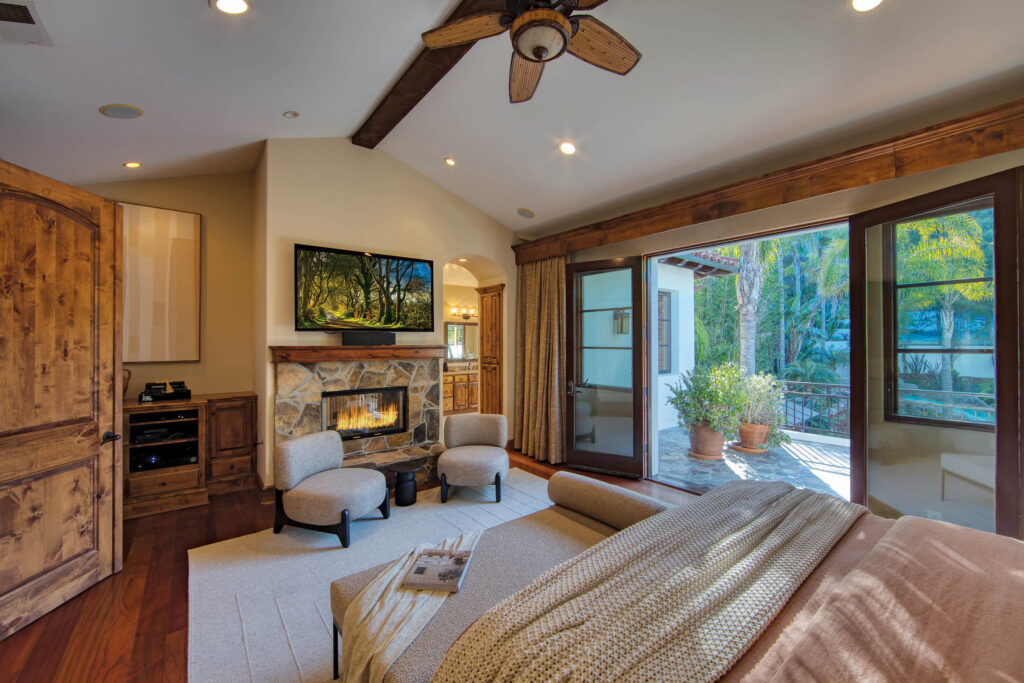 Upstairs, five bedrooms sustain the indoor-outdoor flow with access to a balcony or a rambling terrace overlooking the landscape. The primary suite stands apart with a stone fireplace, cathedral ceiling, and a bath where you can soak over garden views.