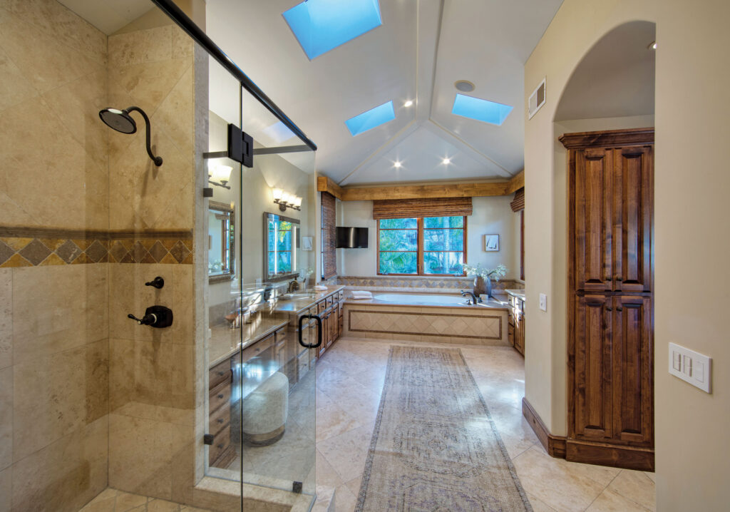 Twenty-five-foot ceilings flood the main gathering areas with natural light, while abundant glass and French doors blur boundaries between the indoors and the lush landscape. Brazilian cherry floors anchor bright, open interiors with a warm glow, while architectural details—columns, exposed beams, and custom cabinetry—add a grounded sense of luxury.