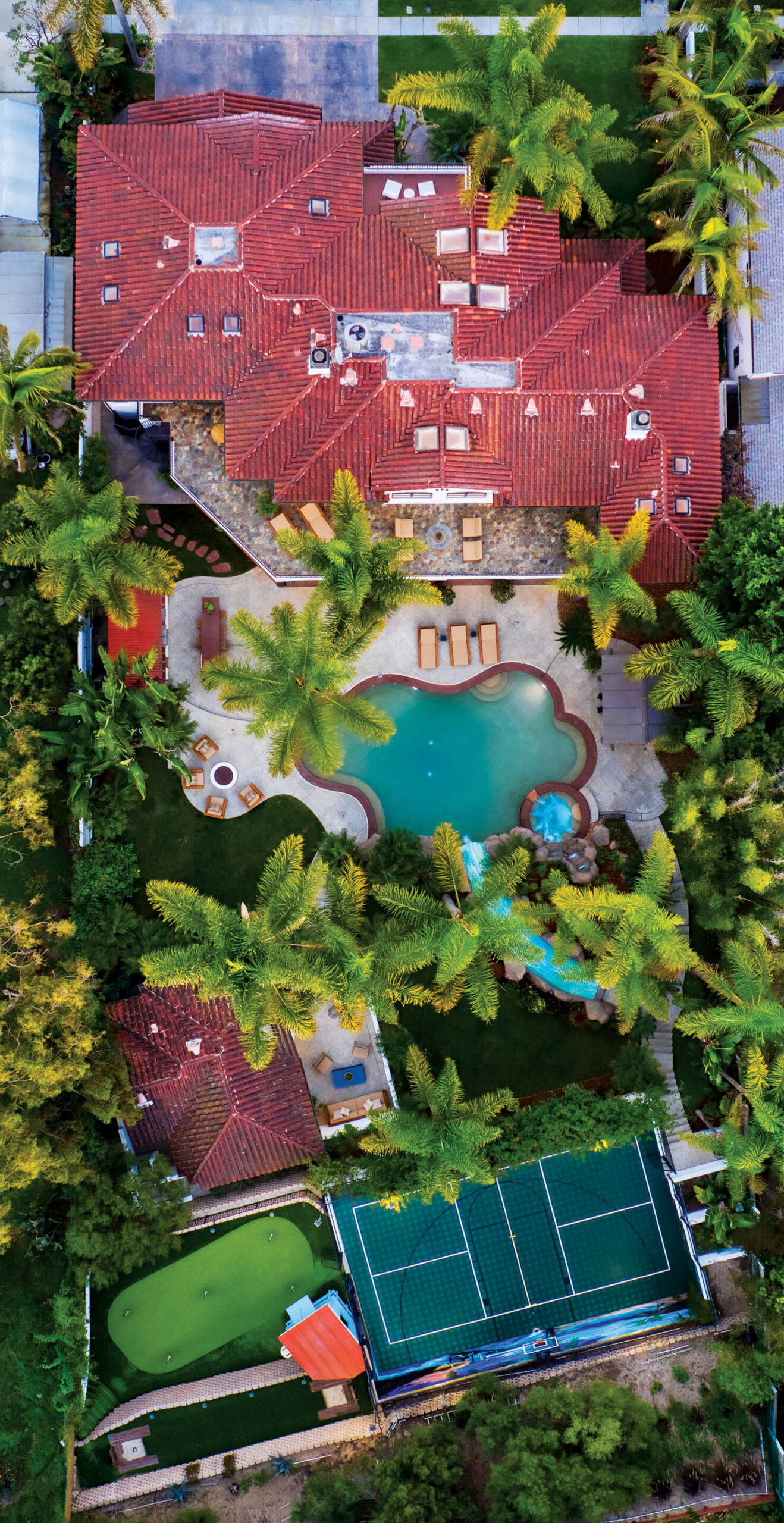 Thirty-five mature palm trees reach skyward, 30 to 40 feet high, adding drama to a setting that’s played host to countless parties and celebrations.