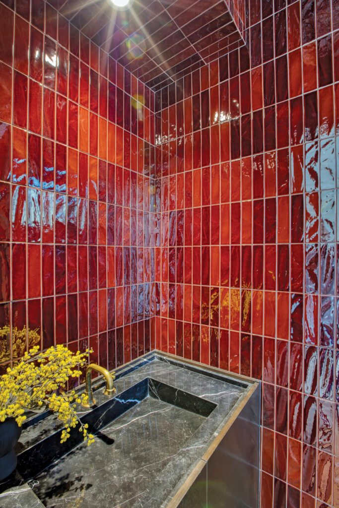 Vince Altamura, on the other hand, has a passion for the powder bath on this floor. Doused in jewel-box burgundy, the space is small in size but big on vibes, done floor to ceiling in glossy Crème Brûlée tiles for a mesmerizing, light-reflecting depth, juxtaposed with lustrous brass hardware and a Nero Marquina stone countertop with integrated sink.
