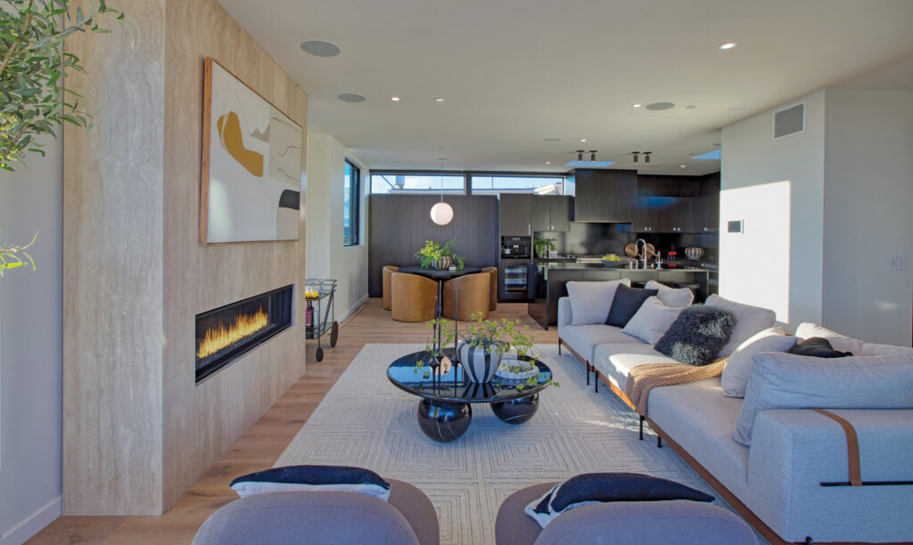 All clean lines and sharp angles, the four-story, 2,600-square-foot house is a spectacle from the street, marked by an architecturally forward facade of mocha crème limestone, smooth plaster, slatted wood accent walls, and exaggerations of glass, complemented by an immaculate Mediterranean-inspired landscape, complete with an olive tree at the entrance, enhancing 315 25th Street’s curb appeal.