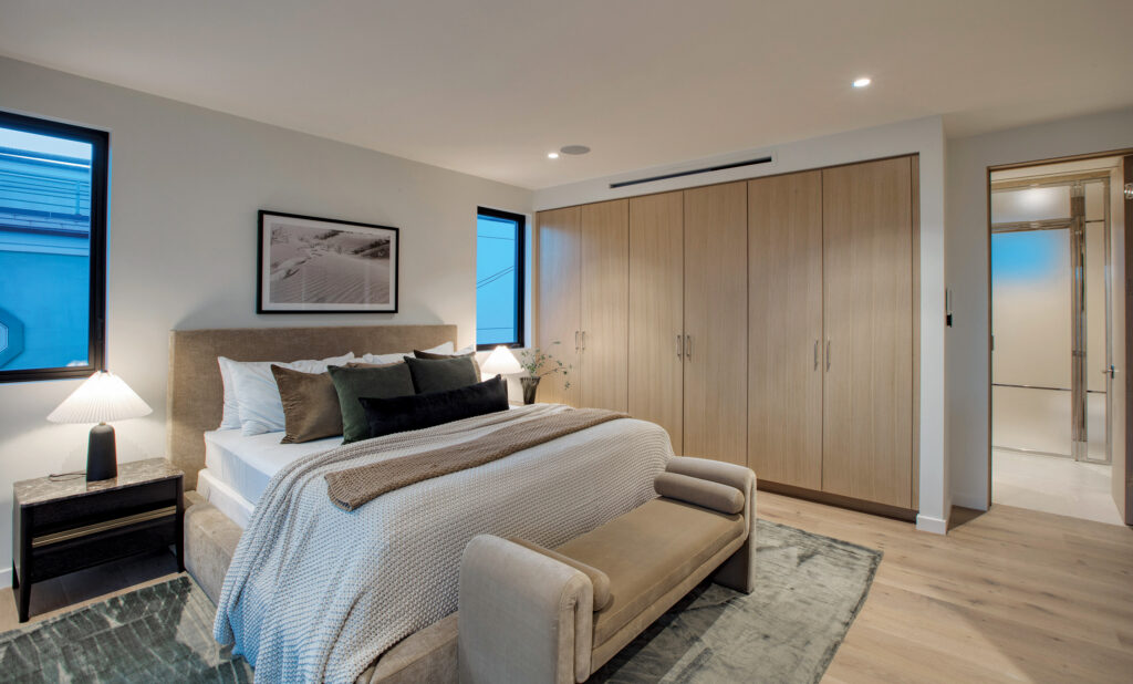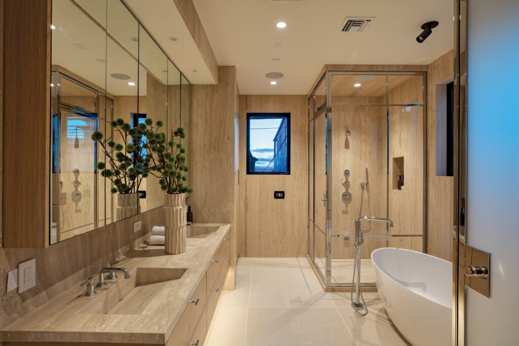 Explicitly minimalist but superior in quality, this sumptuous escape is swathed floor to ceiling in Roman Travertine from Modul Marble, including Beaumanière limestone floors, and Roman Travertine countertops with integrated sinks and polished chrome hardware. While conspicuously classy, the space, in the style of a resort spa, is restrained, featuring a modern soaking tub, private water closet, and a linen closet, but an absolutely spectacular bespoke glass-cage shower from Met-Tee in North Hollywood. Reflecting the purity of fine design, it is trimmed in shining silver, punctuating a truly radiant space. “It’s just so perfect,” says Altamura.