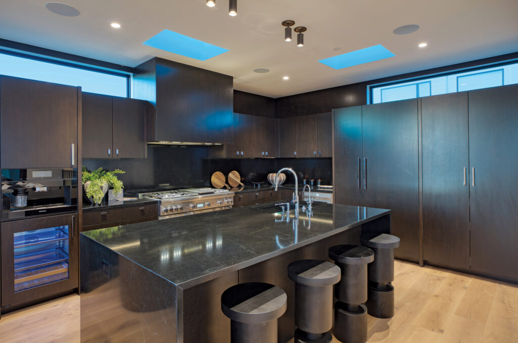 Notable for its contrasting tone, the kitchen features panels of espresso-stained cabinetry that visually help expand the space while giving it a clean, unfussy look that chimes with the soapstone countertops with marble detail. While the space is no shrinking violet, skylights and upper windows make it feel lighter than even the boldest black.