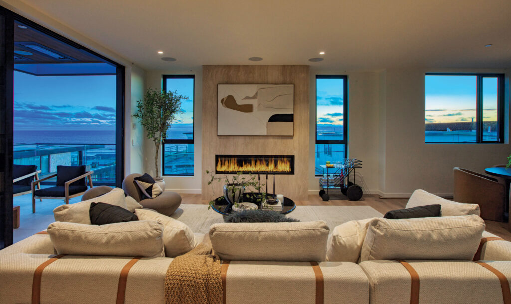 Above and beyond, the upper level is a lightshow. Fixed with thoughtfully placed windows and sliding glass doors, it is airy and bright with sunlight, supporting sublime indoor/outdoor living when opened to the magnanimous covered balcony with exuberant ocean view. The wood accent wall and Beaumanière Limestone floor here are chic motifs repeated throughout 315 25th Street. Inside, light casts beautifully about, highlighting the living room with a fireplace, a dining area with statement lighting, and the bold showcase kitchen.