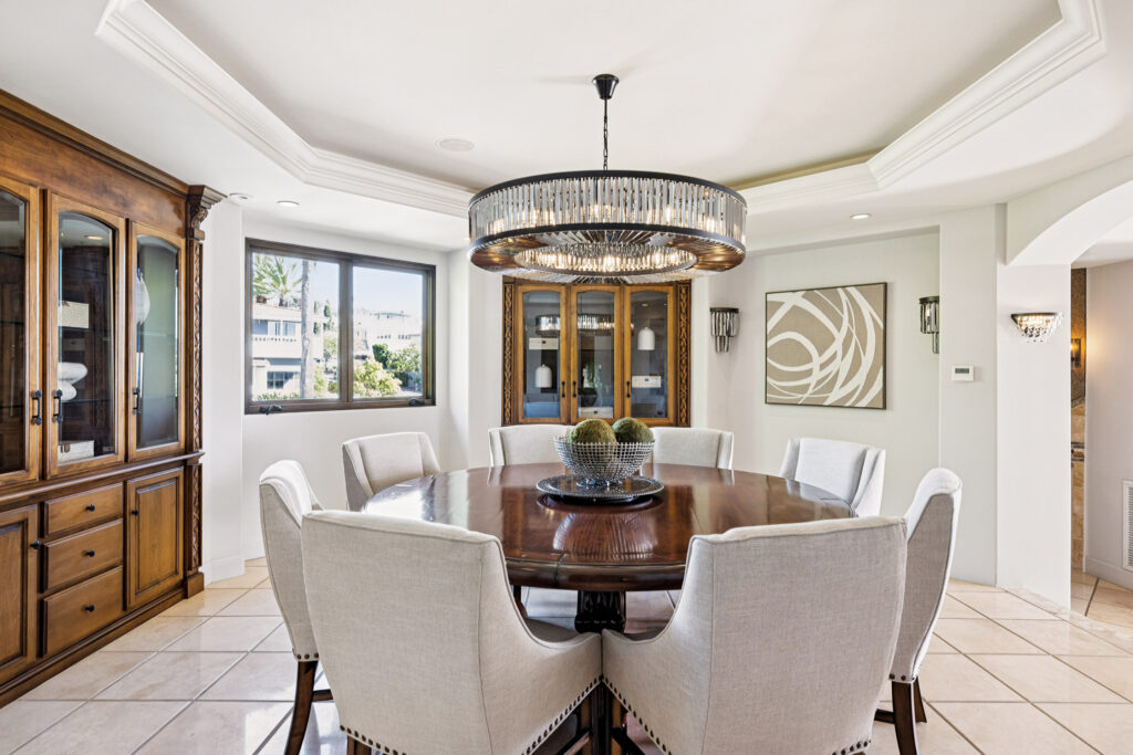215 Poinsettia Avenue’s upper level elevates everything else. A showpiece with a splendid and expansive view, this sunlit, perfectly planned level supports three outstanding living spaces—the largest and most centrally situated has a fireplace and elaborate glass doors that open to a generous balcony overlooking the lush backyard with views beyond. Radiating out from here is a cozy sitting area; a library/study space with coffered ceilings, a fireplace, and a bar; and a light-filled dining room with substantial built-in storage and a dazzling modern chandelier.