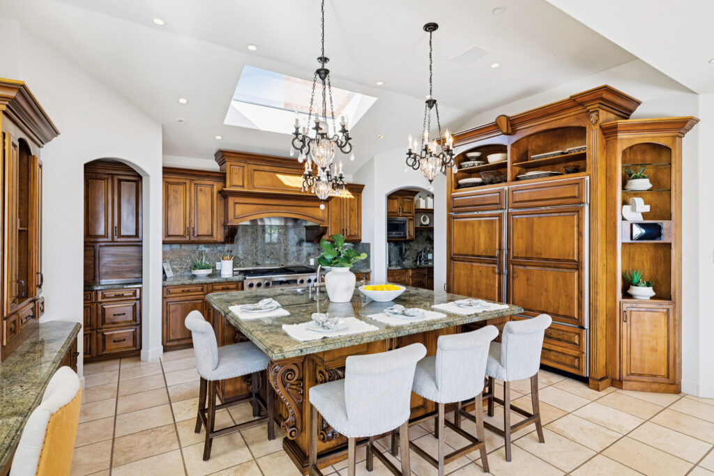 To that end, he points to the gourmet kitchen—a chef’s kiss of a space finished in high-end designer appliances, including Sub-Zero refrigeration, a Dacor 6-burner range, double warming drawers, and two Miele dishwashers to go with a vast, gather-around granite island, double butler’s pantries and a built-in work area.