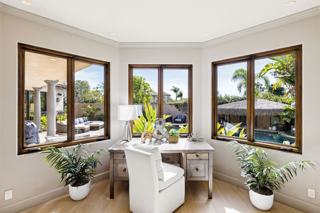 Positioned as 215 PoinsettIa Avenue’s pleasure center, the tropical backyard oasis with White Lotus vibes is both a private refuge and entertainer’s ideal, fixed for five-star fun year-round with a fireplace, a pool, a spa, a swim-up bar and, in the most conspicuous nod to island style, a grass-roofed tiki bar that faces the pool, making it easy to float by the bar for lunch or drinks.