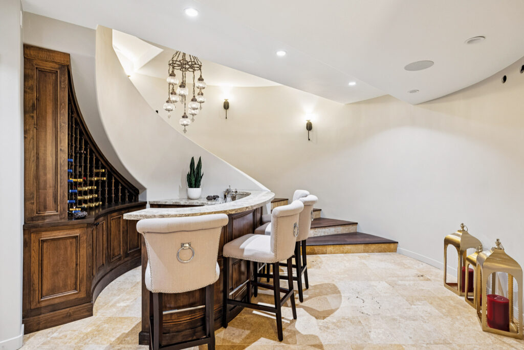 Flaunting an additional family/rec room, a home theatre, full bar, and VIP room, Ed Kaminsky says, “The basement takes on a whole other vibe. It is almost a duplicate of the Foundation Room design from the House of Blues with a very private feel.”