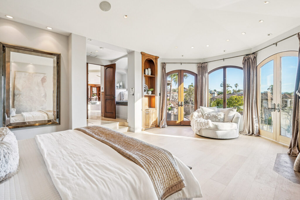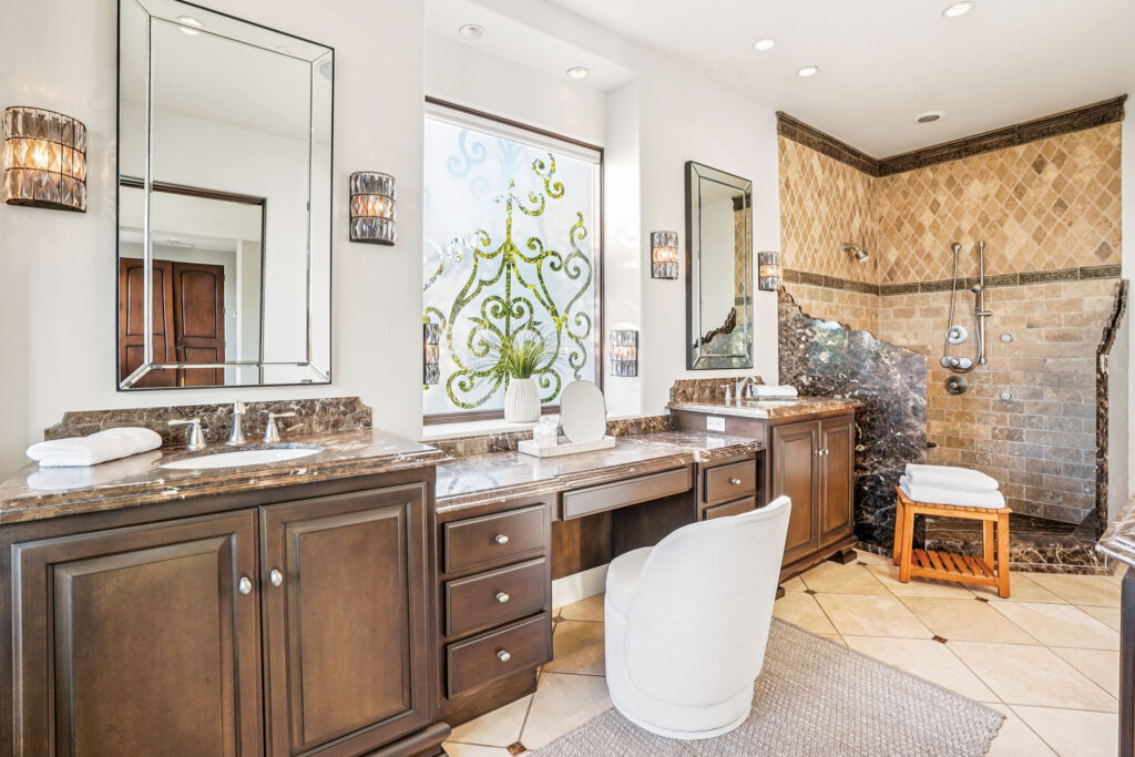 Sharing the upper level, the primary suite with grand double door-entry is plush and well-appointed—a true sanctuary with an exuberant view. Adorned with glittering light fixtures, the bedroom area sports a warm sitting area and three sets of dramatically arched French doors that open to yet another balcony overlooking the backyard. The primary bath, meanwhile, is its equal in elegance, starting with a relaxing alcove and a substantial dual-entry walk-in closet that leads to a soaking tub, dual vanities, and a spa-style shower.